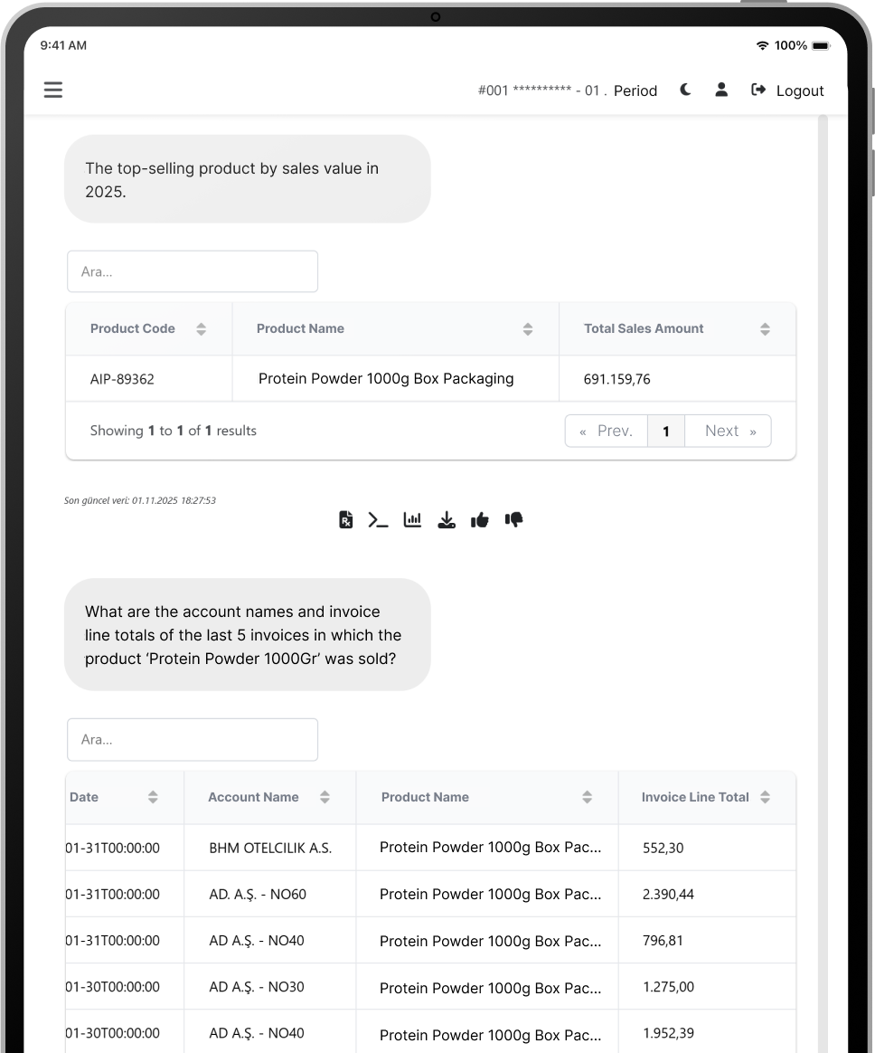 The platform is built for rapid integration with existing ERP infrastructures. Through multi-system compatibility, it can retrieve, interpret, and respond to data from various systems — including accounting and operations management platforms — while maintaining full enterprise-grade compliance.